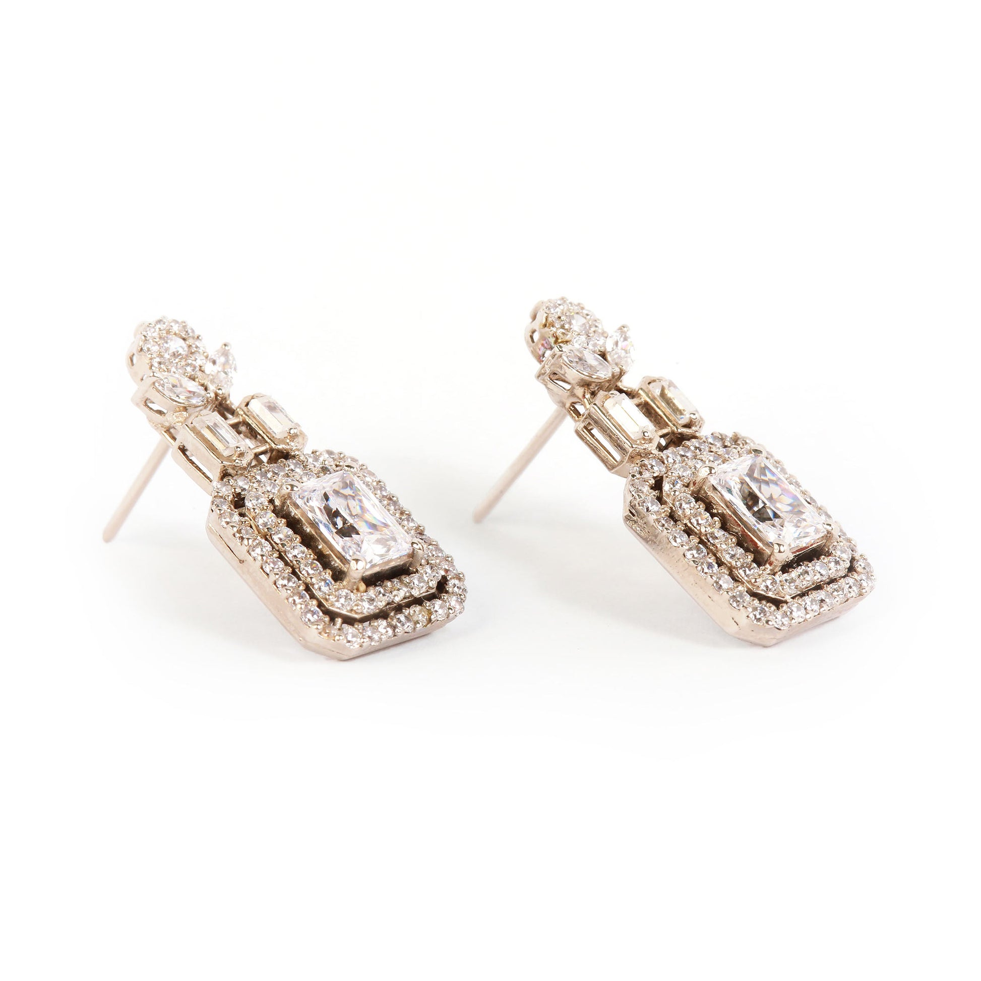Elegant and eye-catching, the Aafreen Luxe earrings feature a sparkling center stone surrounded by two rows of smaller crystals. With delicate baguette and leaf- shaped accents, they add the perfect touch of shine to any formal look.