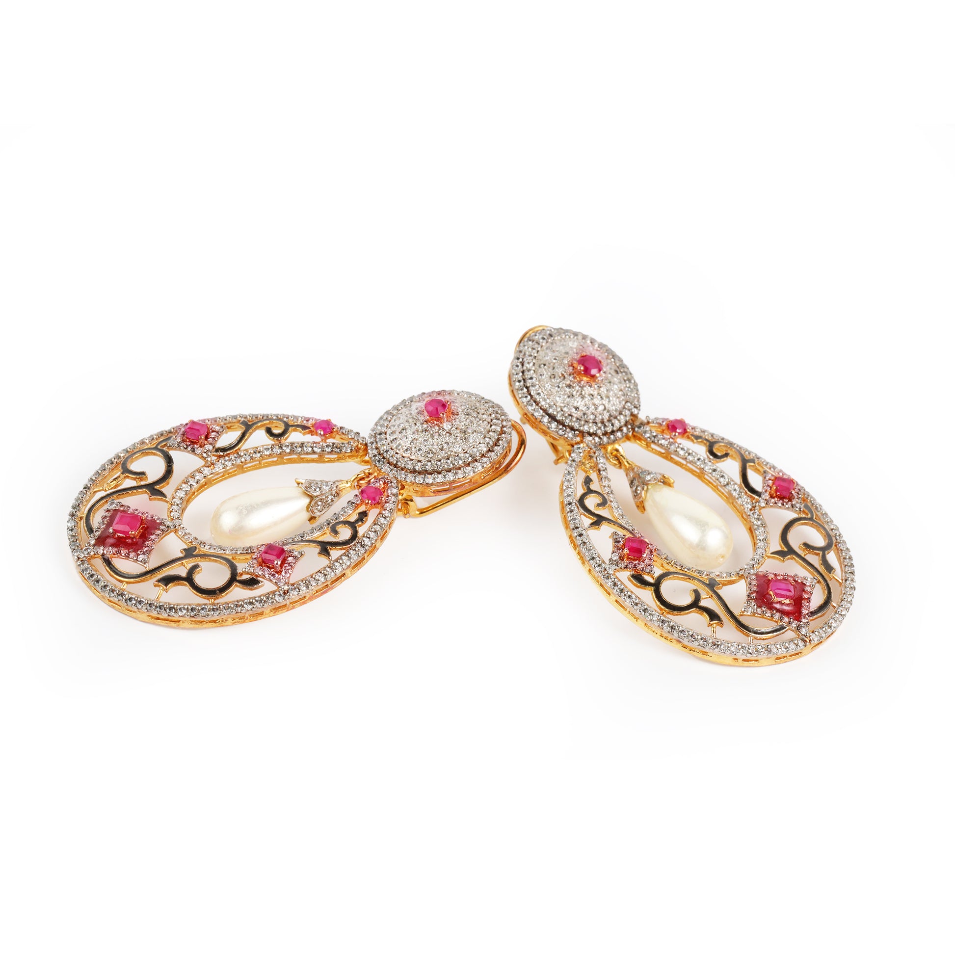 Vintage-inspired gold hoops featuring black enamel scrollwork and geometric ruby-red accents.