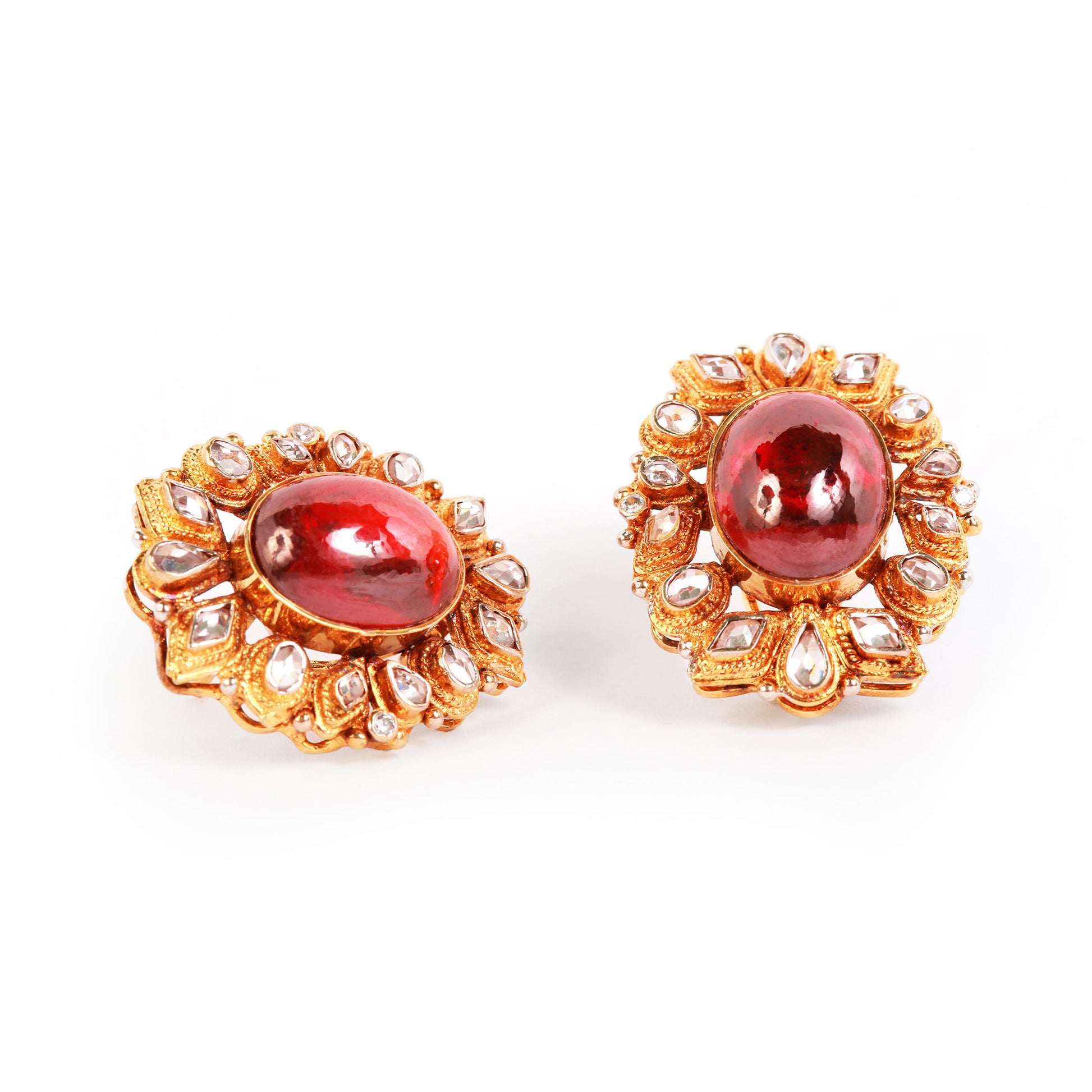 An oval-shaped design centered with a deep red stone - a symbol of celebration. The gold-toned frame is delicately bordered with traditional Kundan work, adding regal charm and festive sparkle. Elevates traditional look with grace.