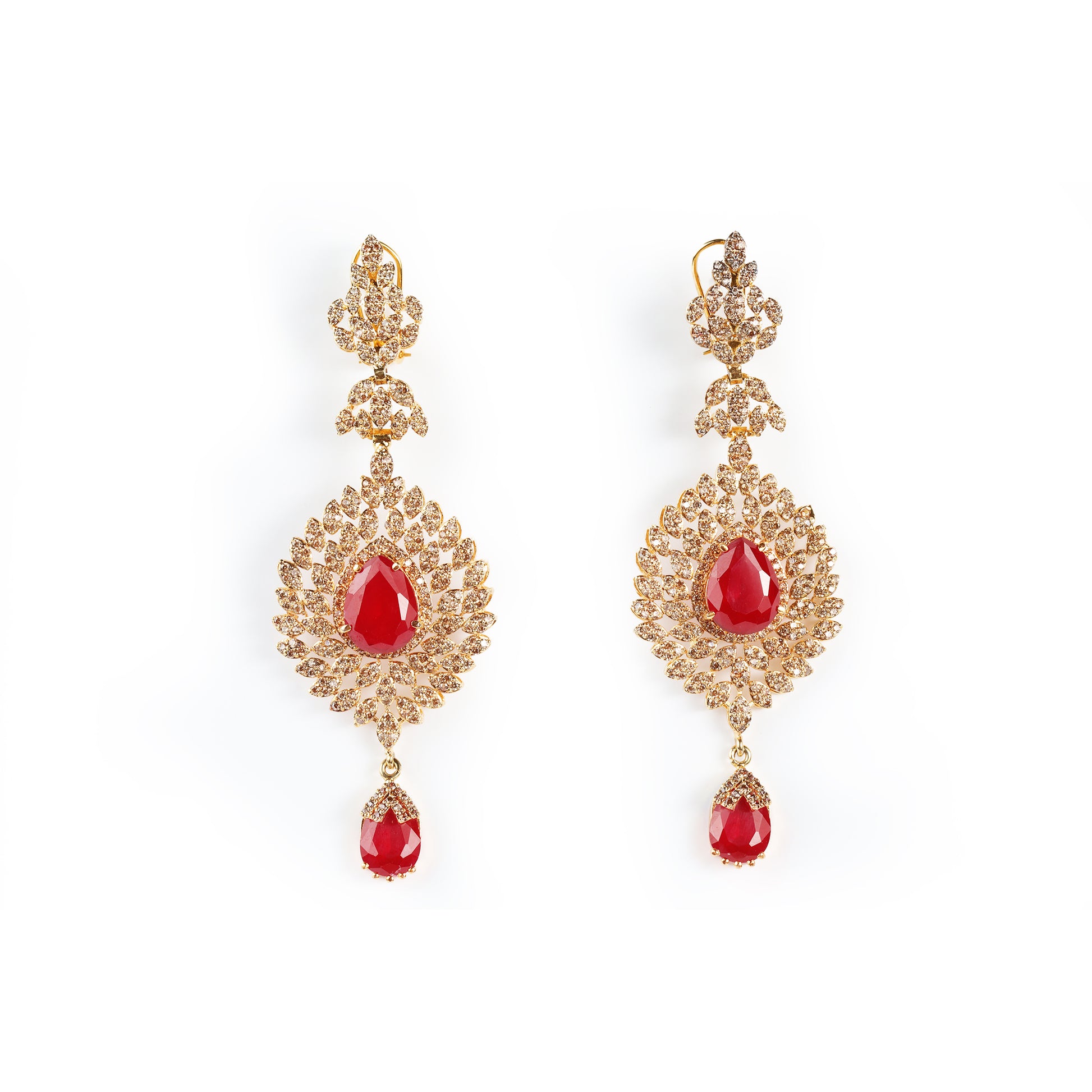 Opulent gold-finish statement earrings featuring a stunning teardrop ruby-style center.