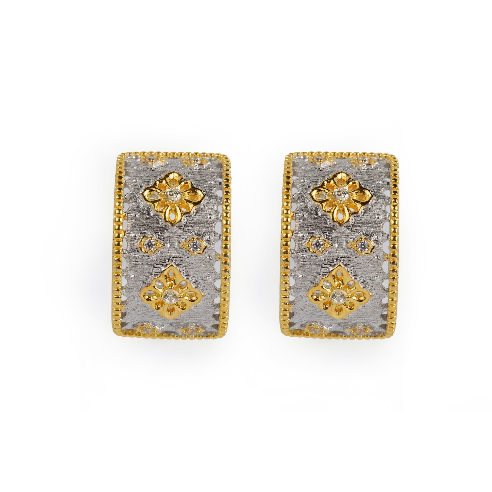 Wide, textured silver-tone hoop earrings decorated with raised gold floral motifs and centered with single clear crystals.