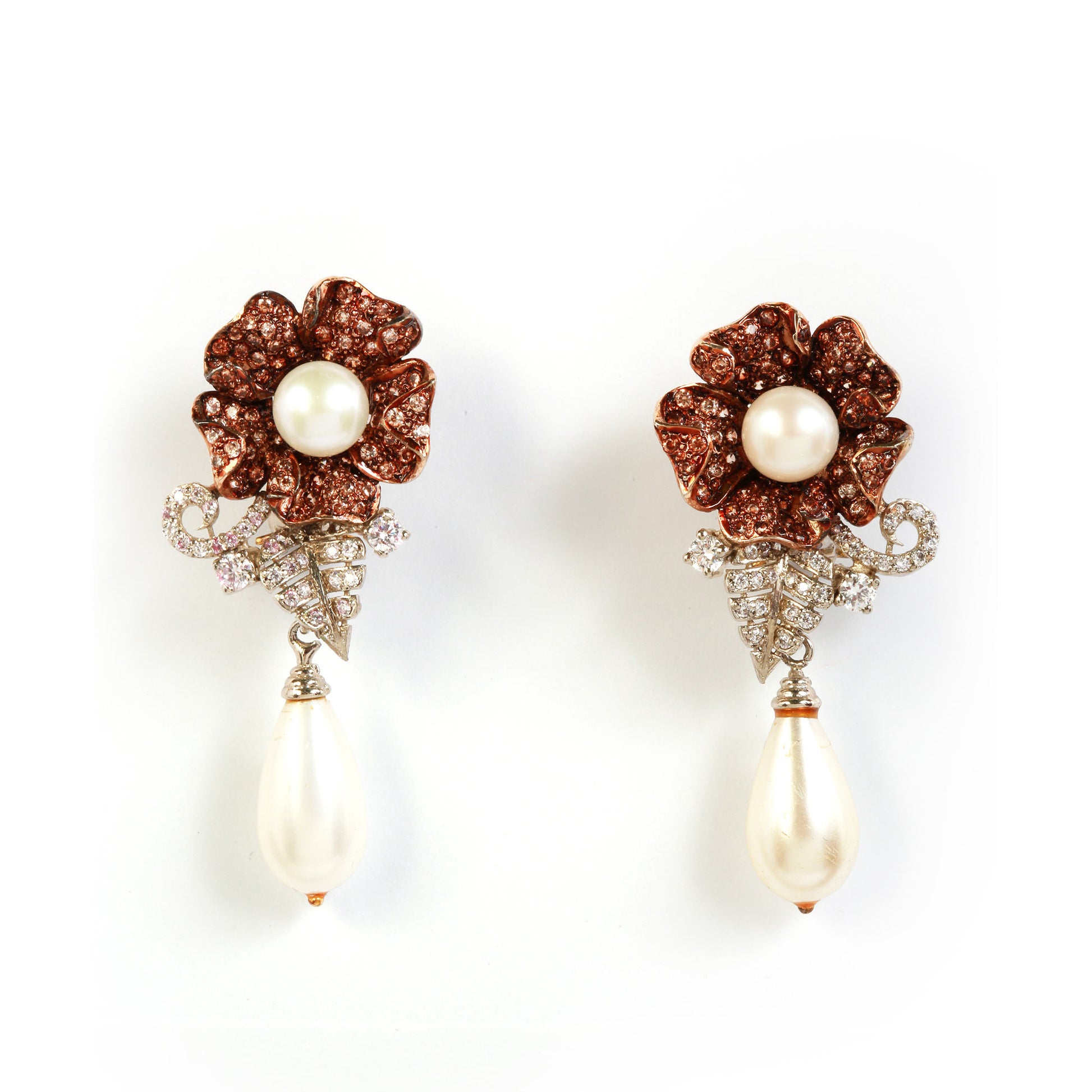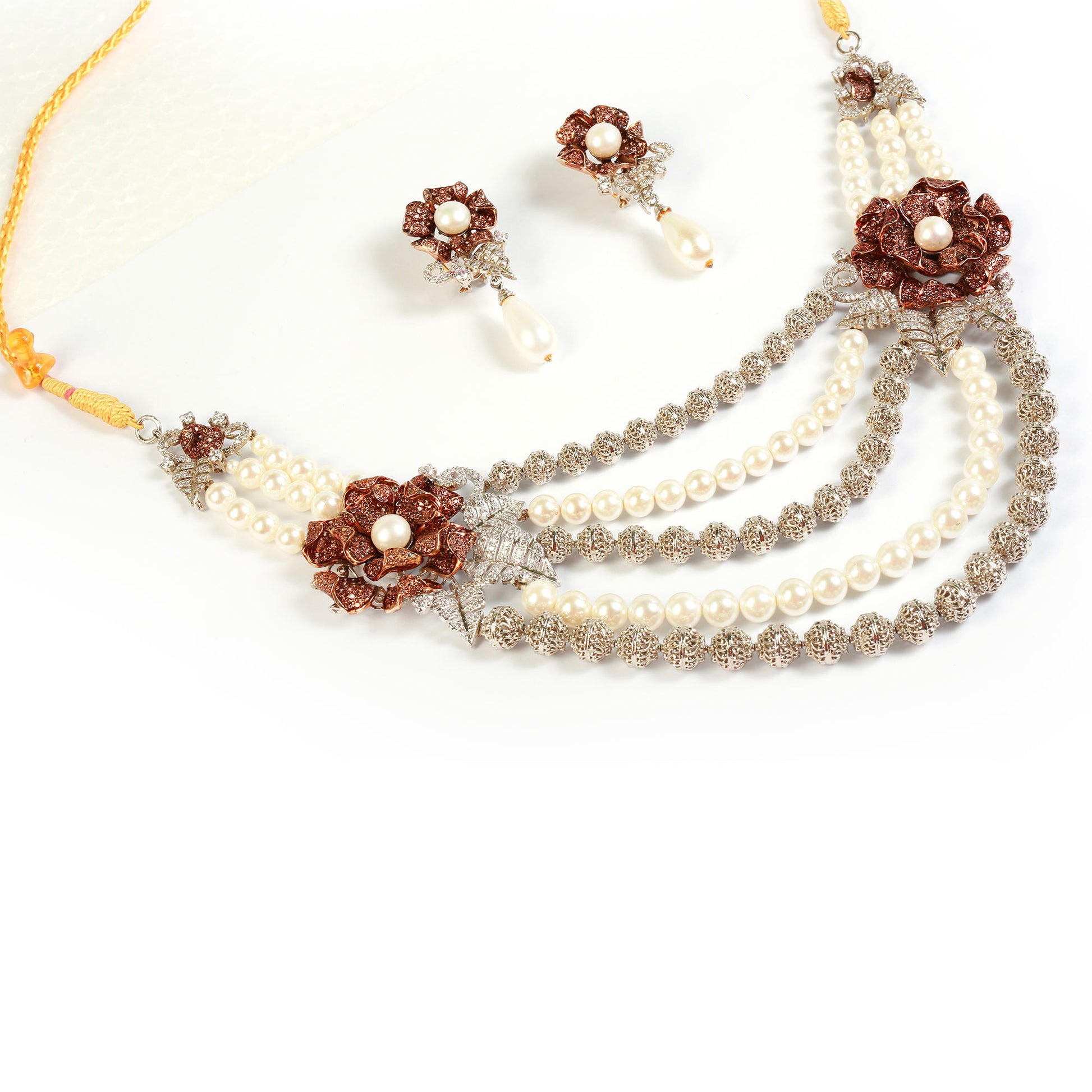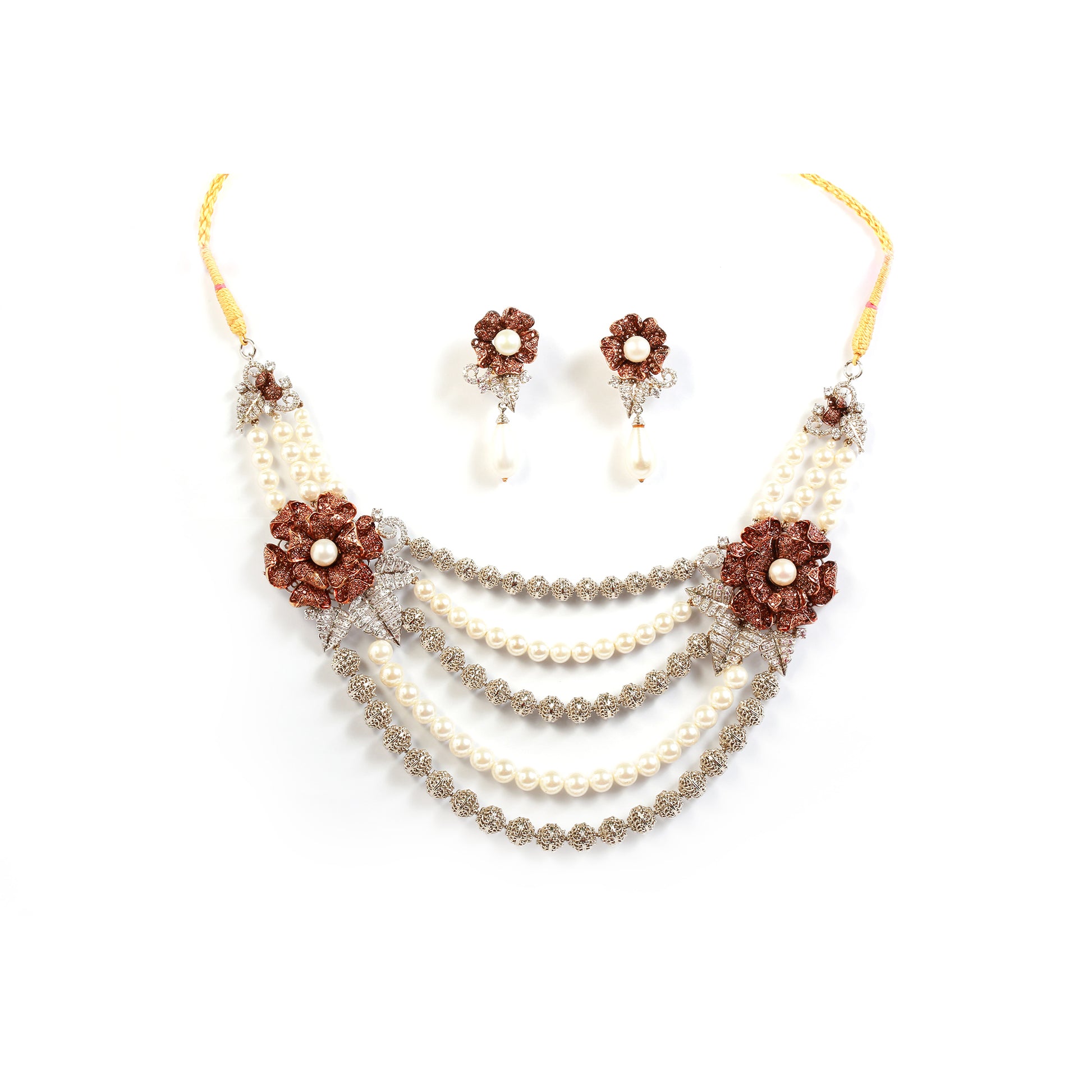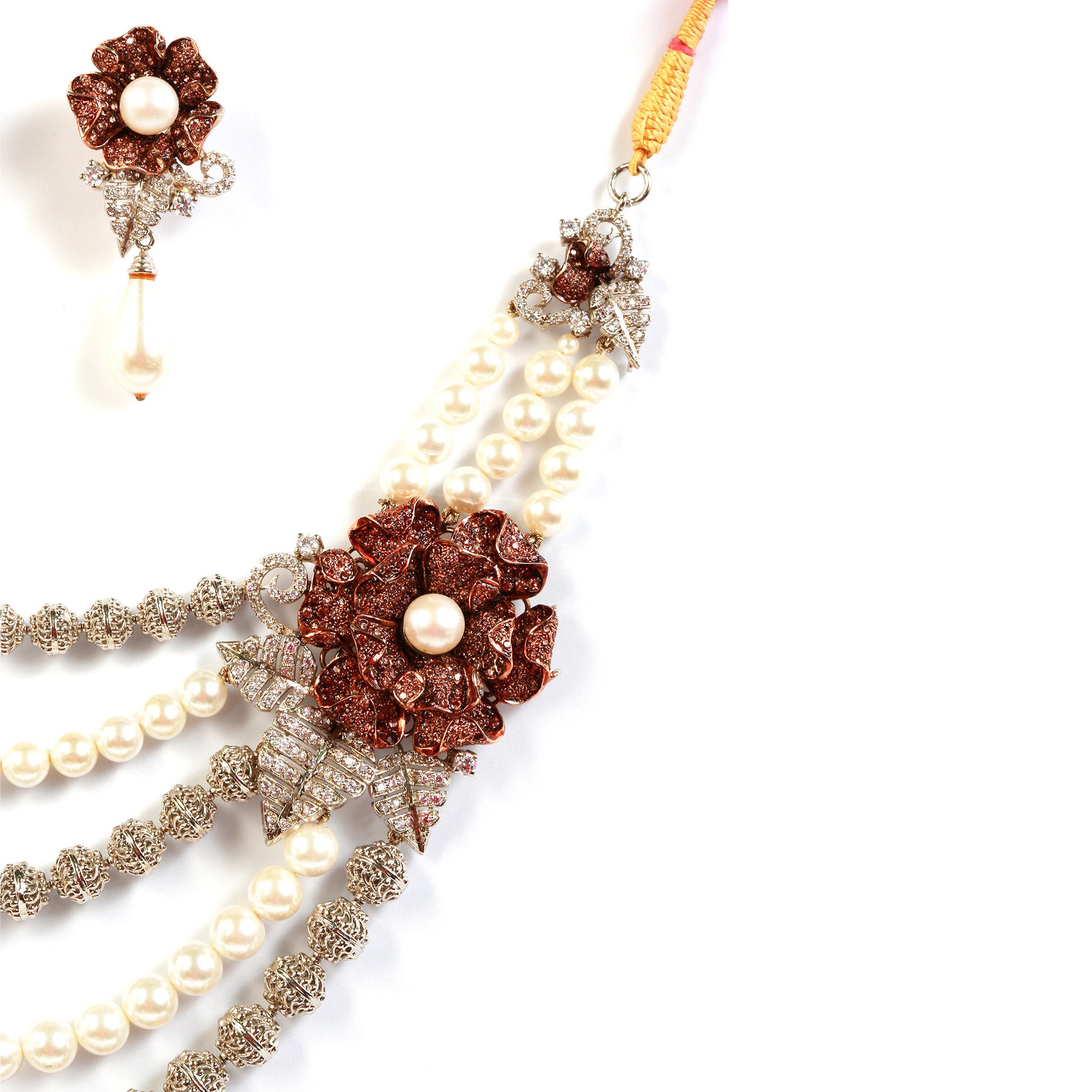 Make a statement with the Scarlet Royale set, featuring five cascading layers of pearls and shimmering silver strands, with striking red flower motifs. Paired with matching dangling earrings, this set is perfect for grand occasions.