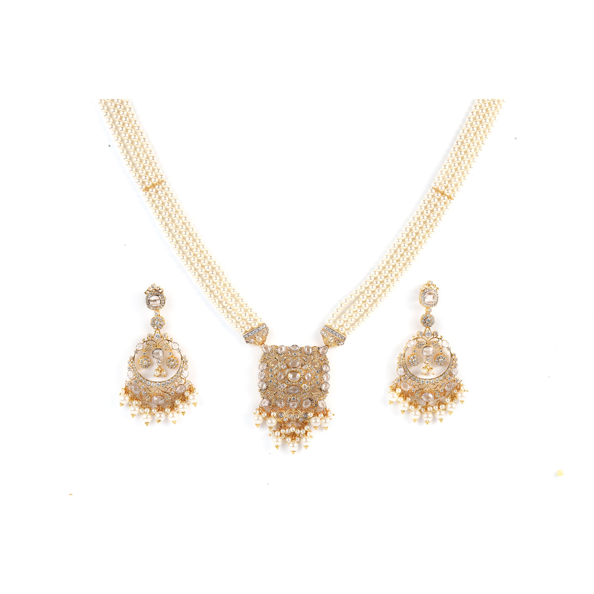 A multi-strand seed pearl necklace paired with a grand Kundan-filigree pendant and matching crescent drops.