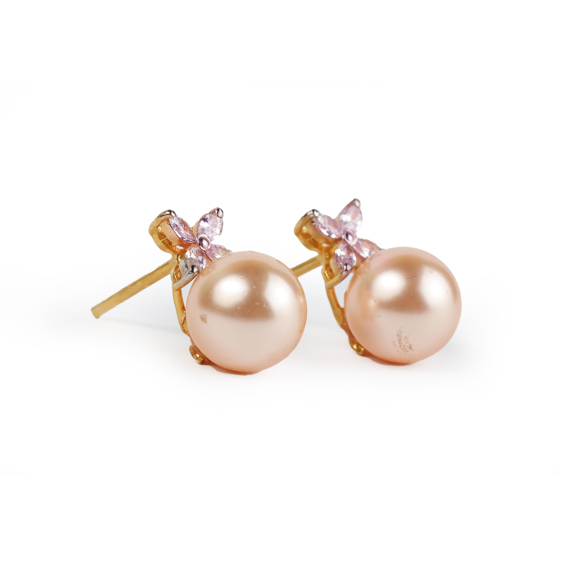 Elegant gold-tone drop earrings featuring a shimmering round pearl suspended from a delicate four-petal crystal bow and a stone-encrusted vertical bar.