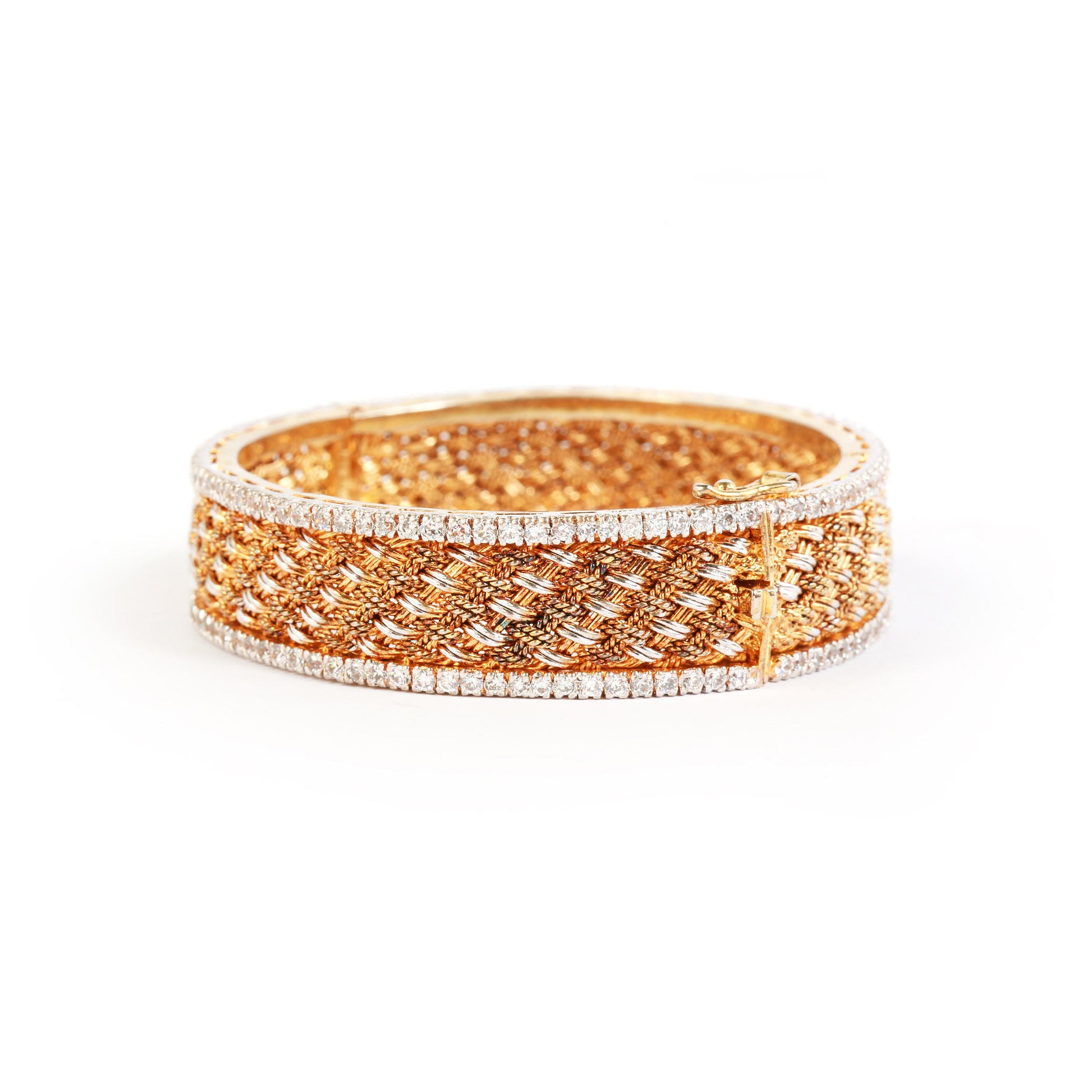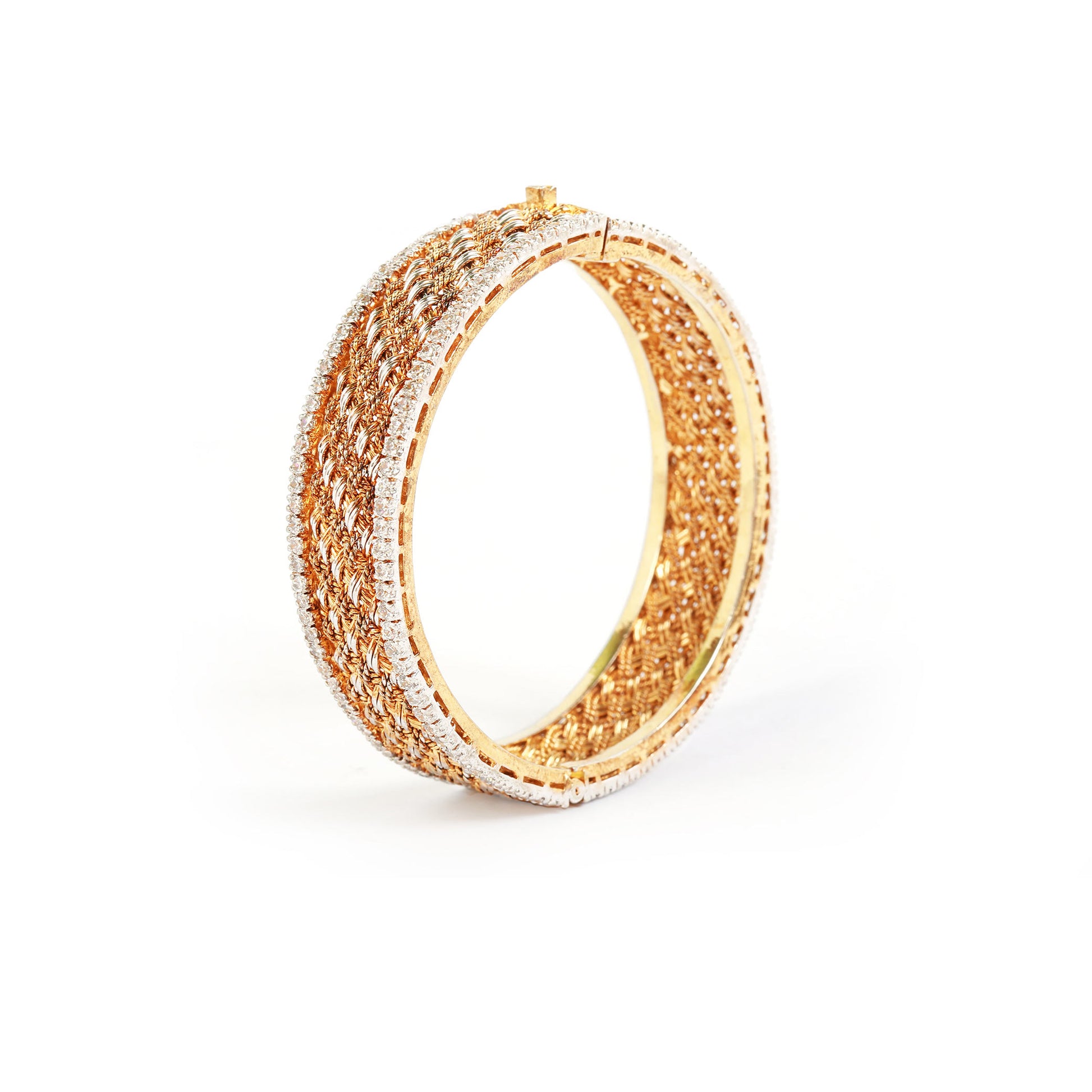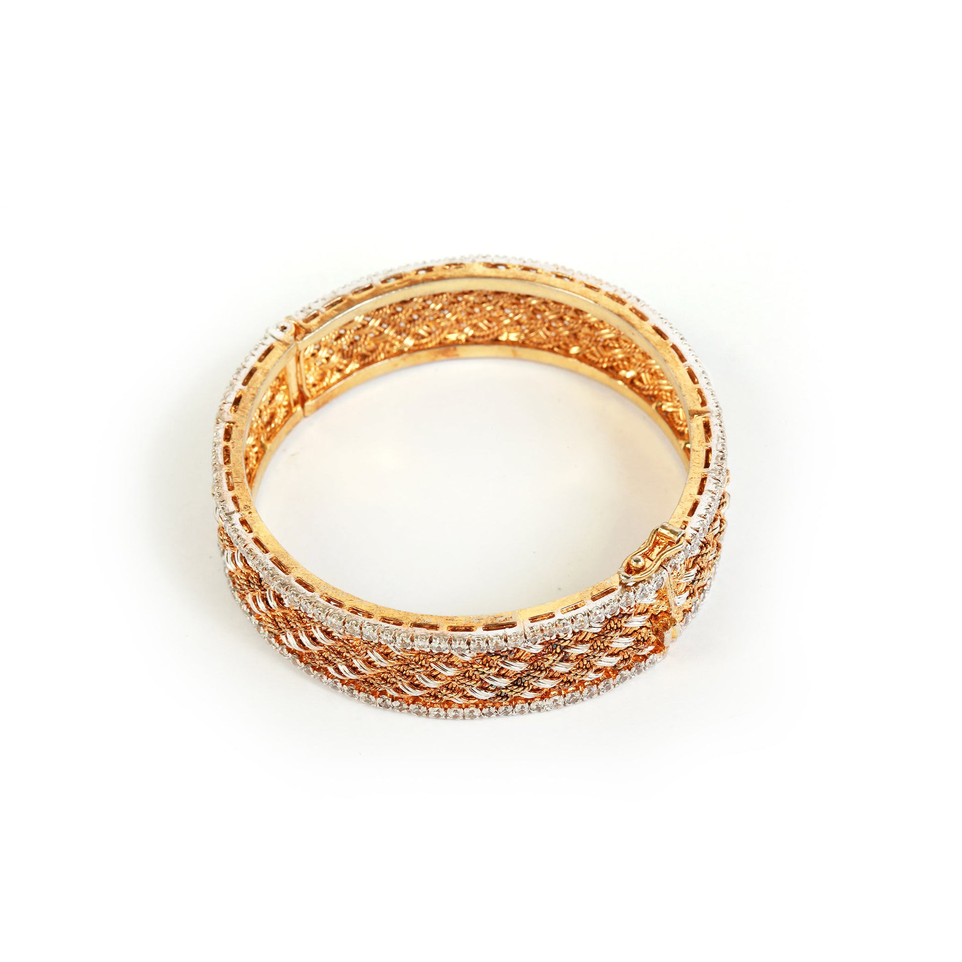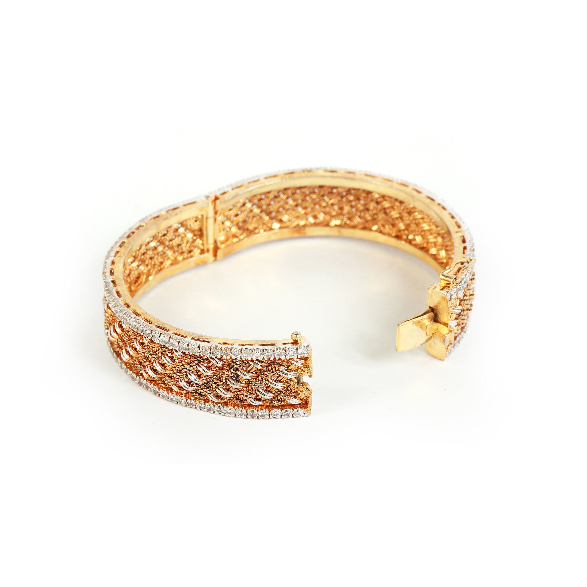 A bold statement band with a polished gold surface, framed by delicate rows of shimmering silver stones on both edges. Its graceful design makes it the perfect accessory for traditional wear, adding a touch of sophistication to any formal outfit.