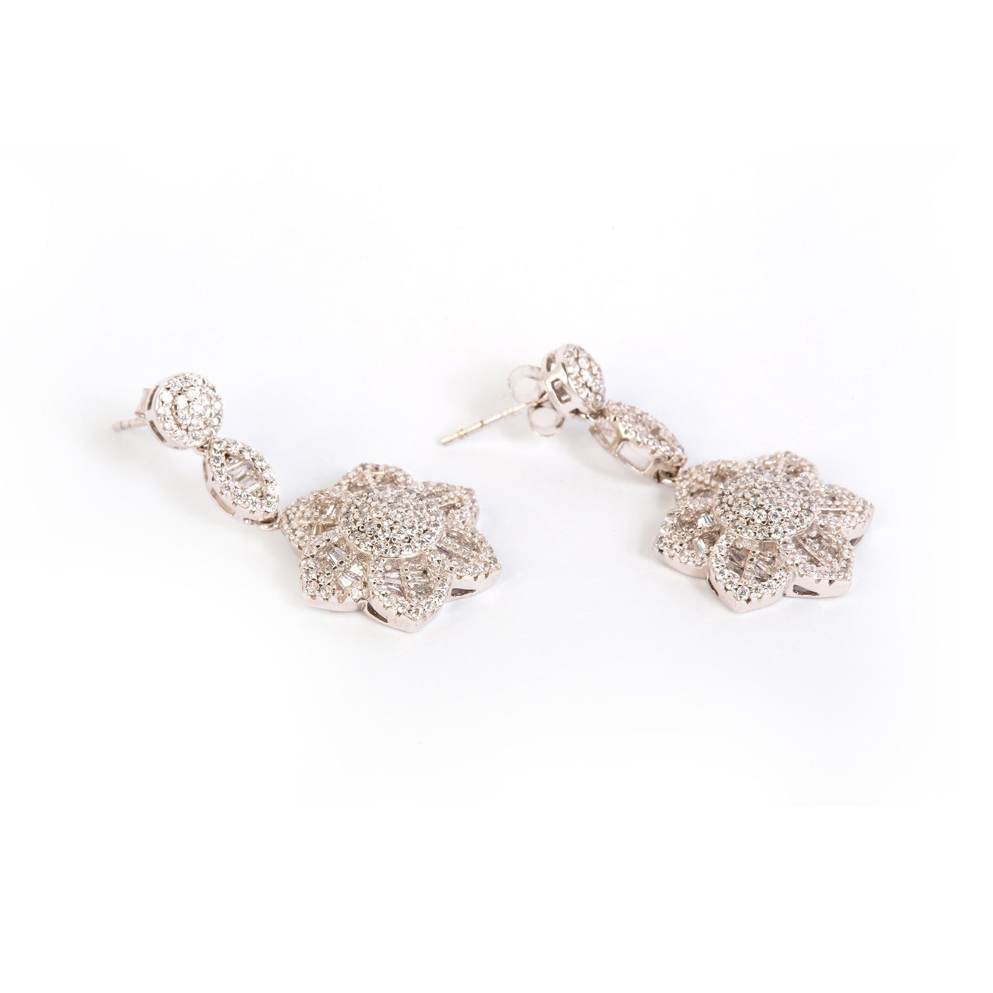 Delicate and dreamy, these earrings feature a small dangling design that shimmers with every sway. The earring ends in a beautifully detailed flower, encrusted with fine silver sparkle. Lightweight yet eye- catching, it’s perfect for adding a touch of festive charm to any look.
