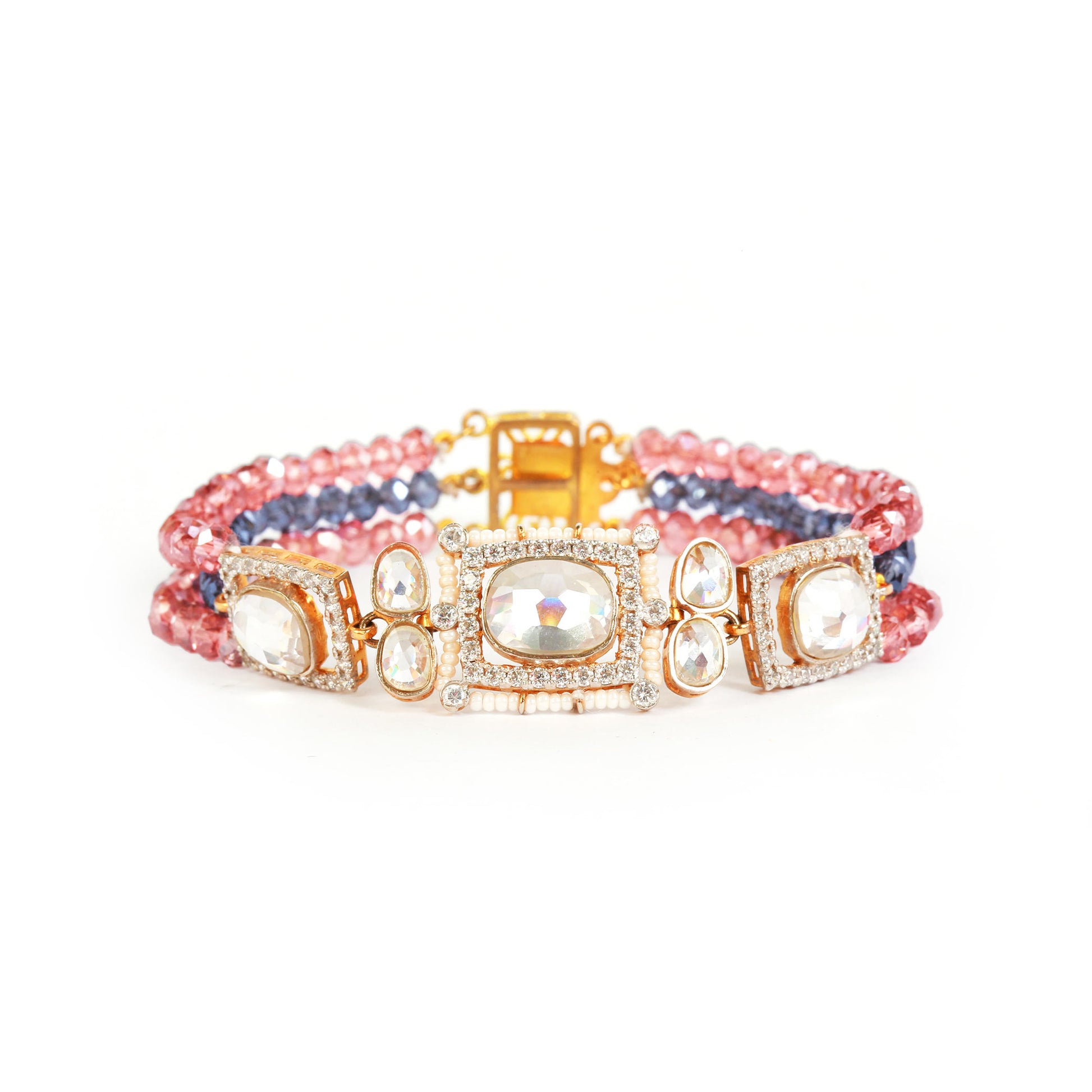 A captivating blend of purple and rich blue crystals flows in three layers, converging at a centerpiece of bold, uniquely shaped silver gems that catch the light with every movement. A perfect piece to pair with evening wear or festive attire.
