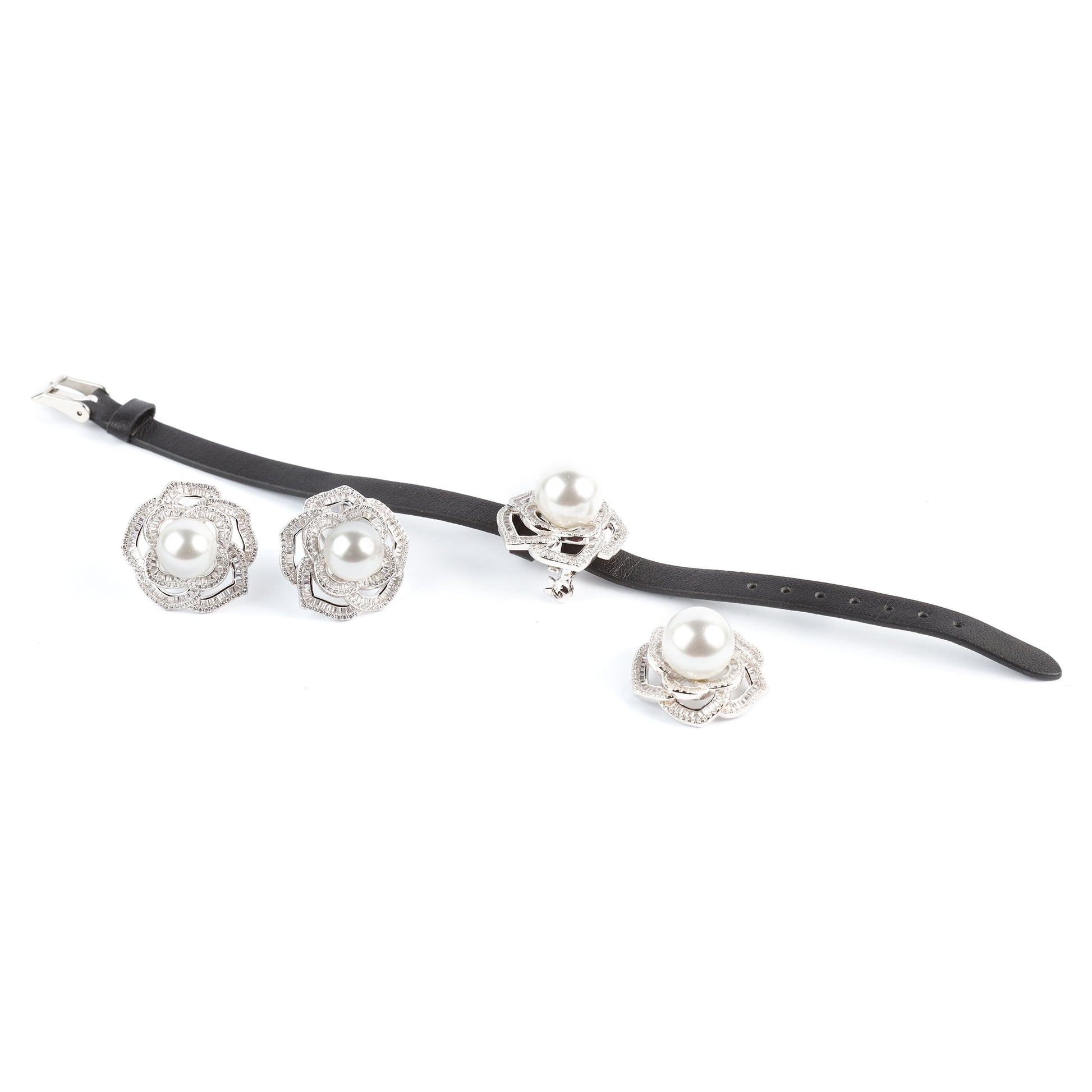 Lustrous pearls nestled in diamond-set roses, showcased on a sleek black leather strap for a modern, edgy contrast.